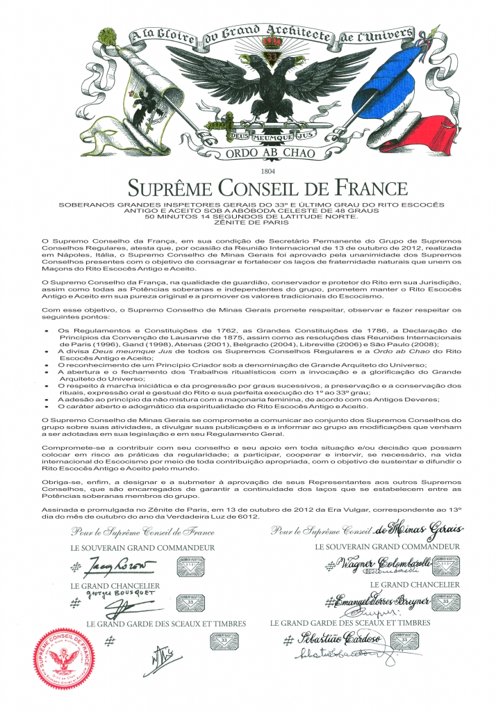 Em setembro do mesmo ano, foi assinado o Tratado de Reconhecimento e Aliança Maçônica, firmados por Arlindo Fernandes de Lima, Soberano Grande Comendador do Supremo Conselho e Athos Vieira de Andrade, Grão-Mestre do GOMG. Tudo foi feito dentro dos mais puros princípios maçônicos e a legislação profana vigente.