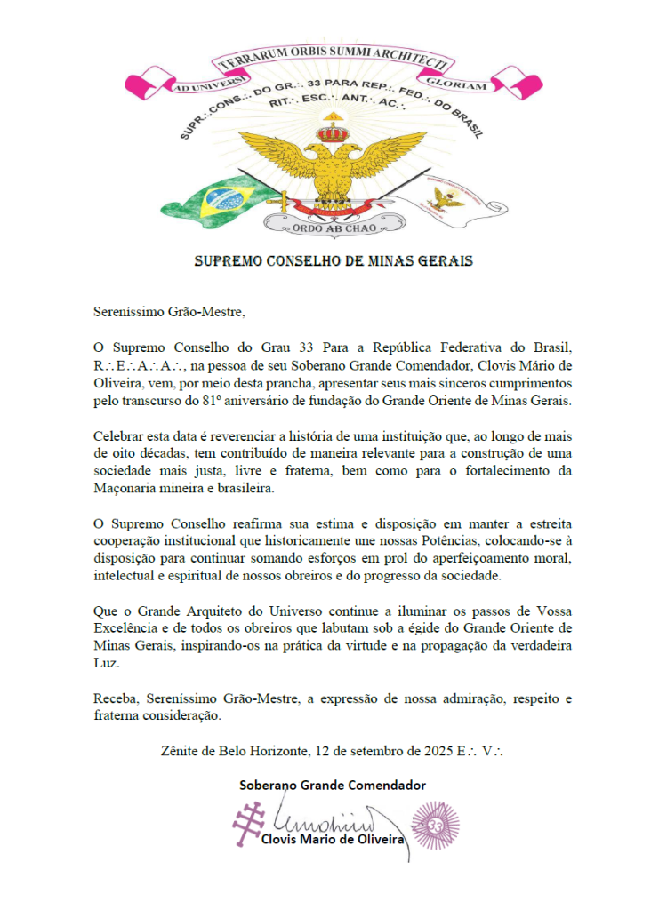 Pelo Sereníssimo Grão-Mestre Adjunto Vanderlei Geraldo de Assis